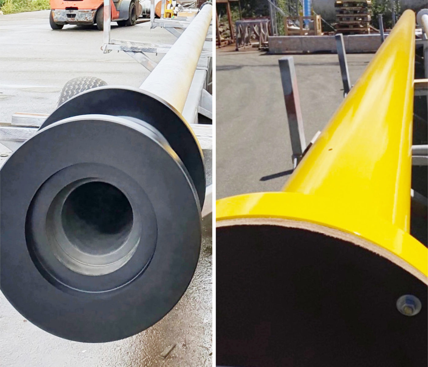 Bildene viser 4 forskjellige overflatebehandlinger som vi har utført. En 15 meter lang Wear casing som er malt iht. Norsok standard (gul farge), og en 15 meter lang Riser sealing mandrel, som er overflatebebehandlet med både Zinkfosfat, Xylan (svart) samt Metalisering på resten utvendig.
